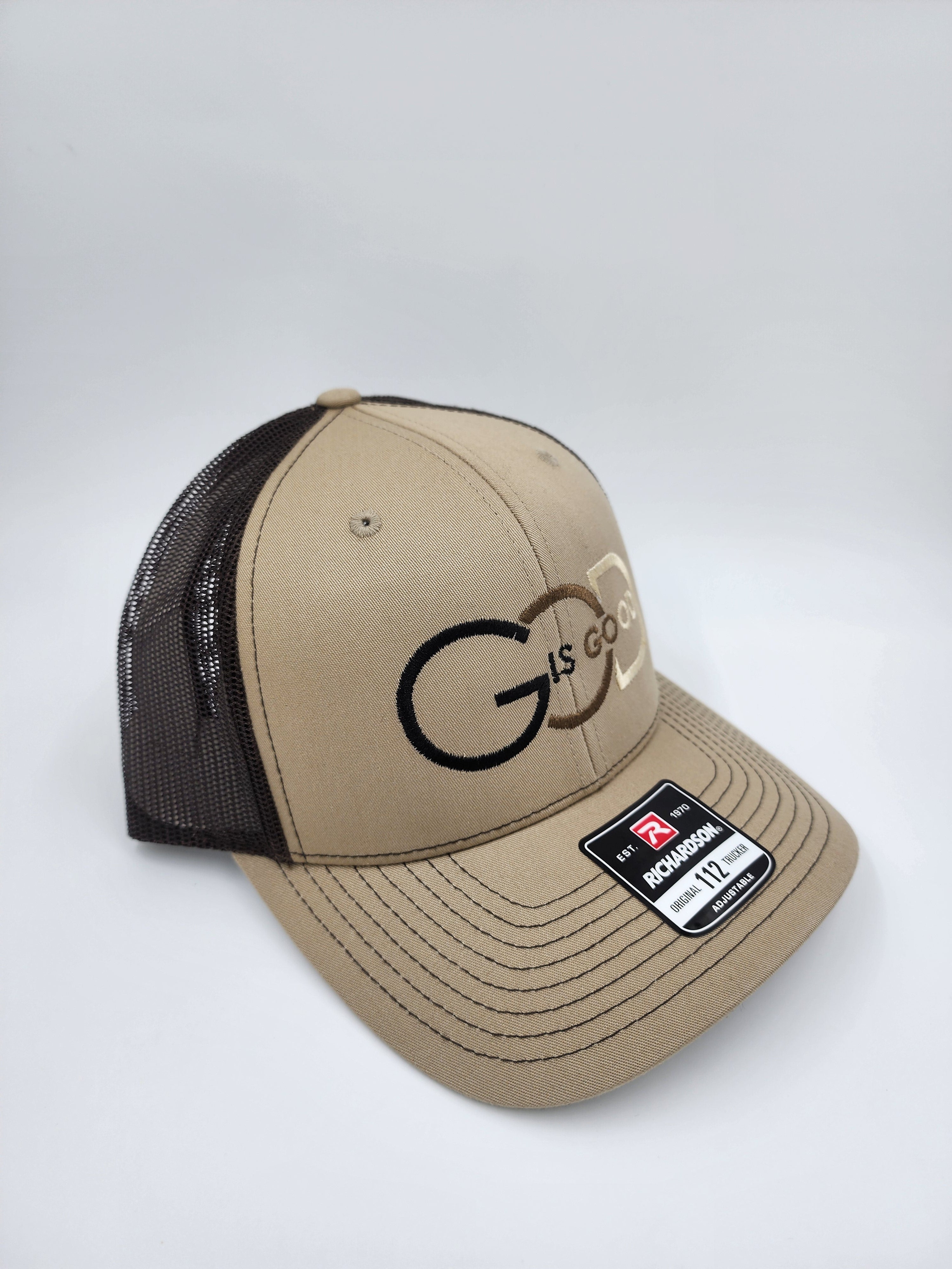 Brown/Khaki “God Is Good Trucker Hat – Minimal Faith Statement | Richardson 112 Snapback”