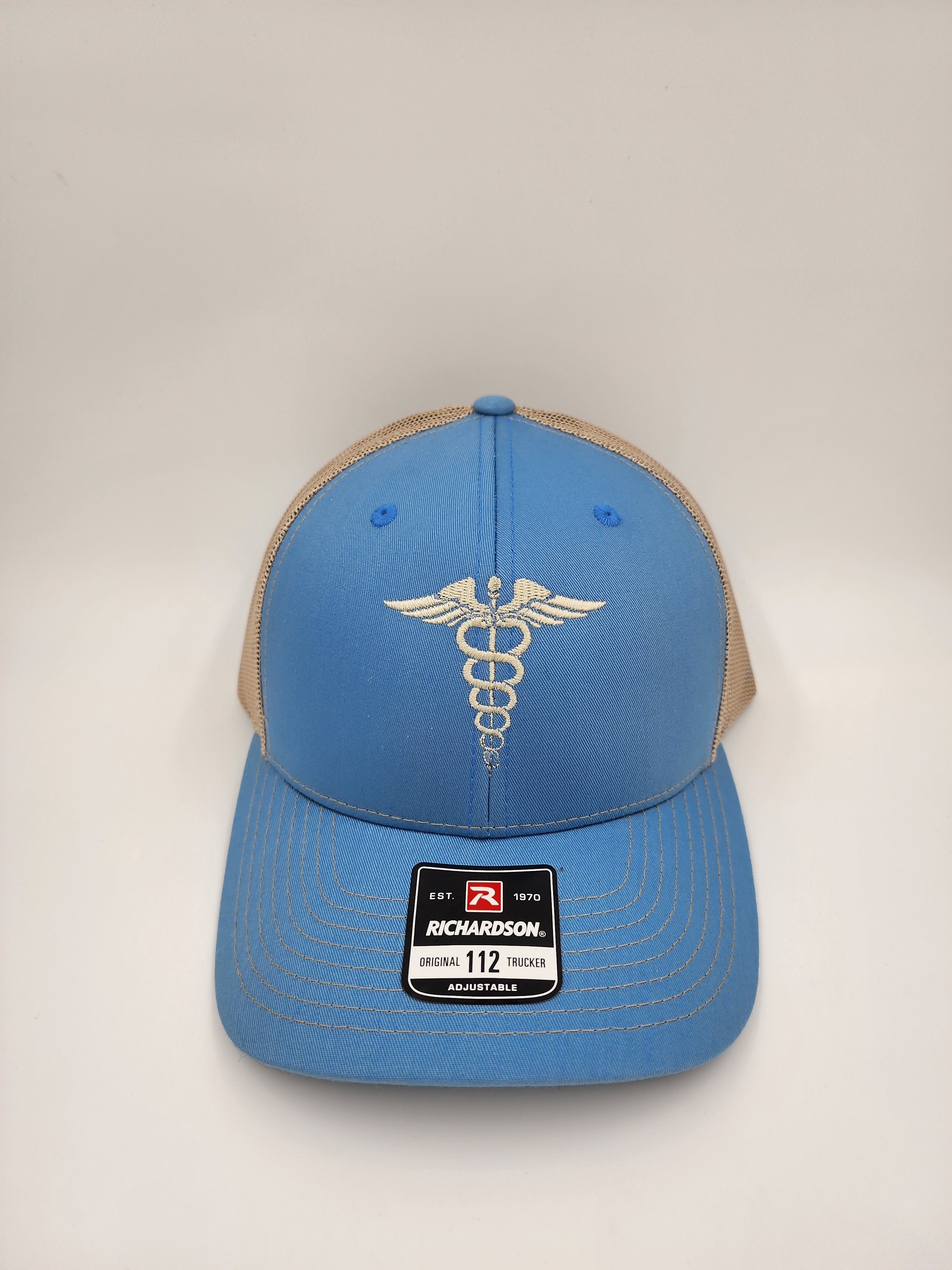Baby Blue/Khaki “Healing Symbol Trucker Hat – Caduceus Embroidery | Richardson 112 Snapback”
